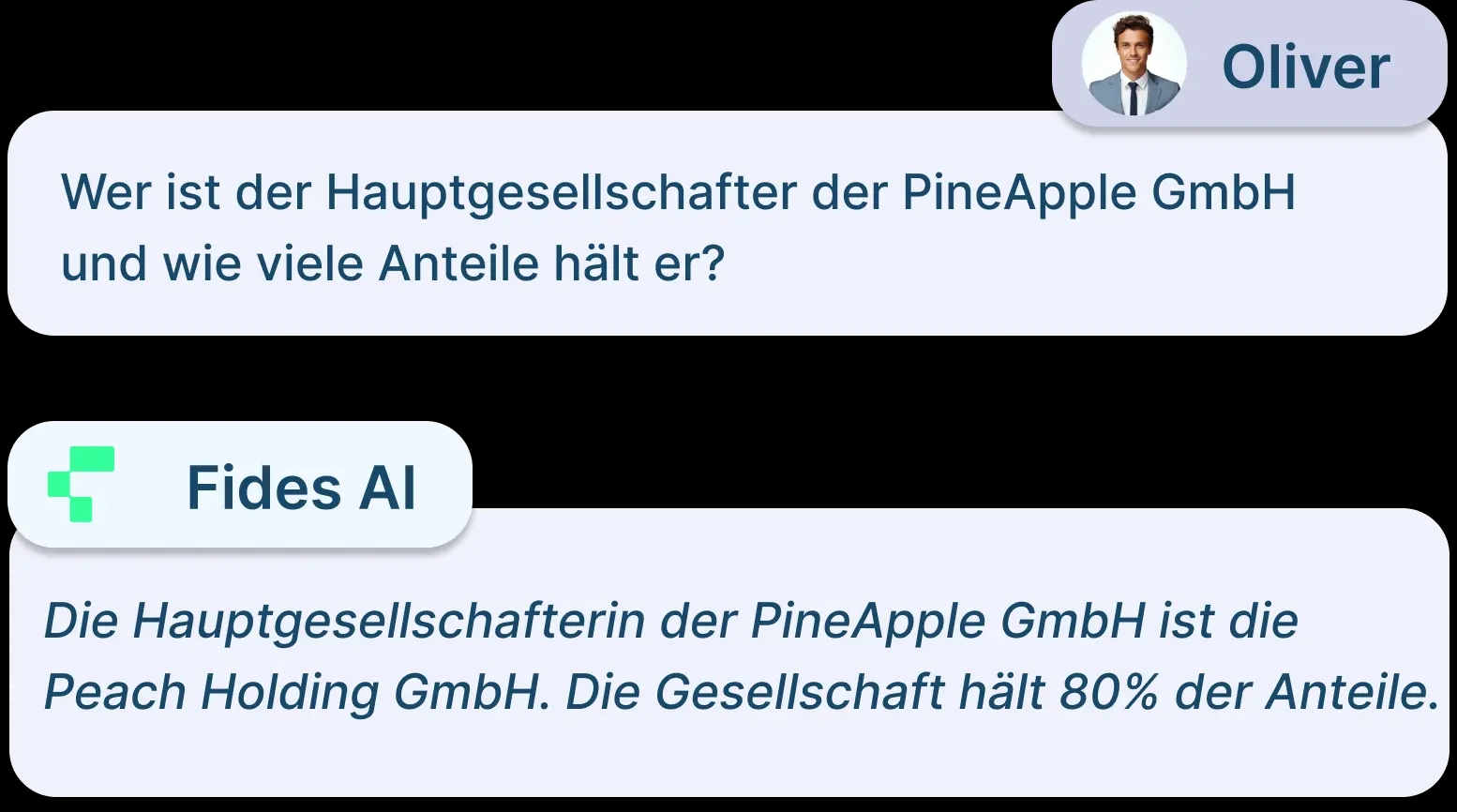 Stellen Sie eine Frage und lassen Sie Fides AI Ihre Dokumente nach der besten Antwort durchsuchen. Dies eignet sich beispielsweise besonders gut bei Fragen rundum Compliance Richtlinien, beim Vorbereiten einer Due Diligence oder um schnell alle Dokumente zu finden, die von einem bestimmten Vorstandsmitglied unterzeichnet wurden.