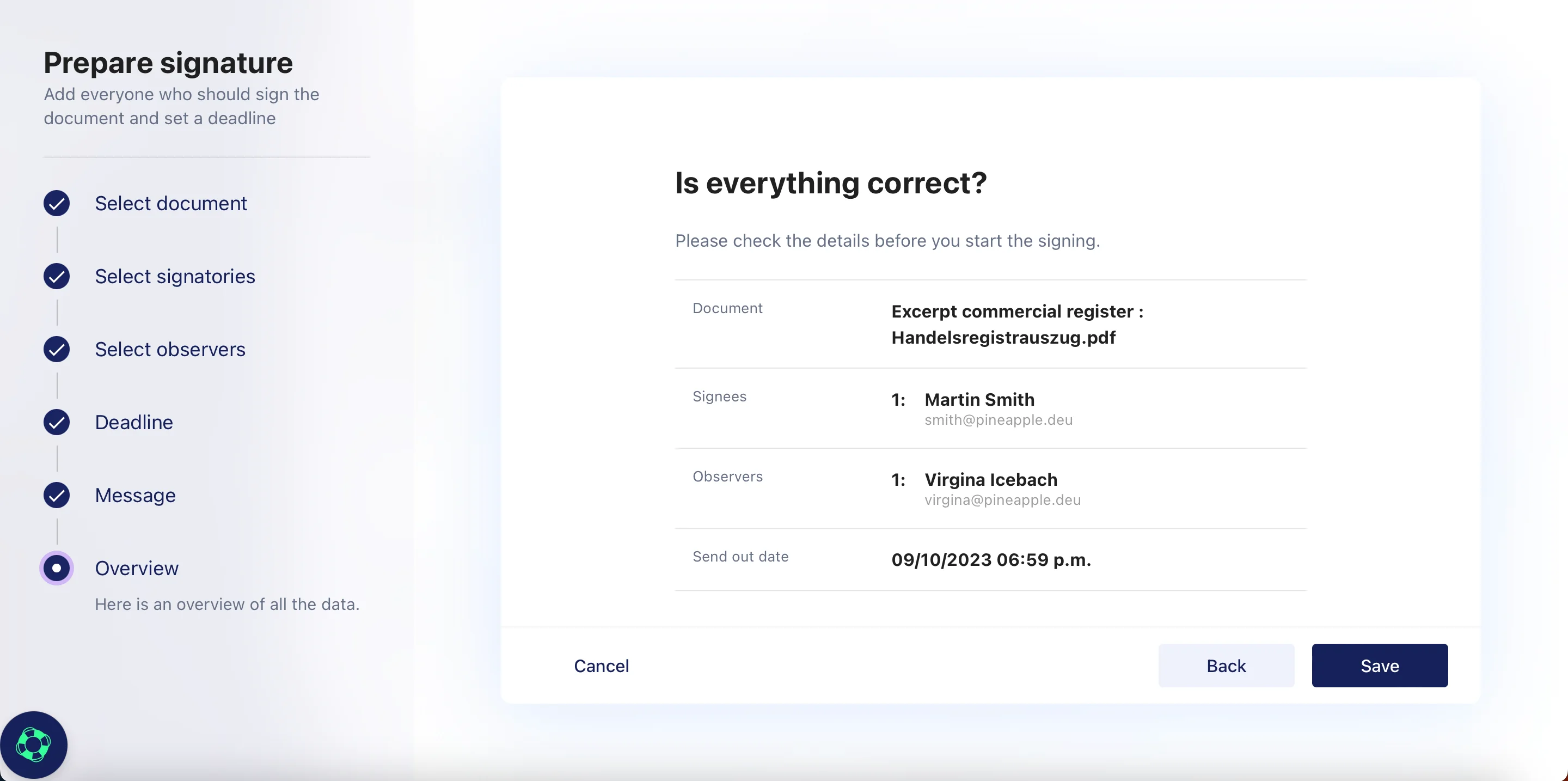 With Fides, you can send any document directly to the signatories via our DocuSign integration for signing and monitoring the progress. Additional functionalities are also available, e.g. assigning cc observers.