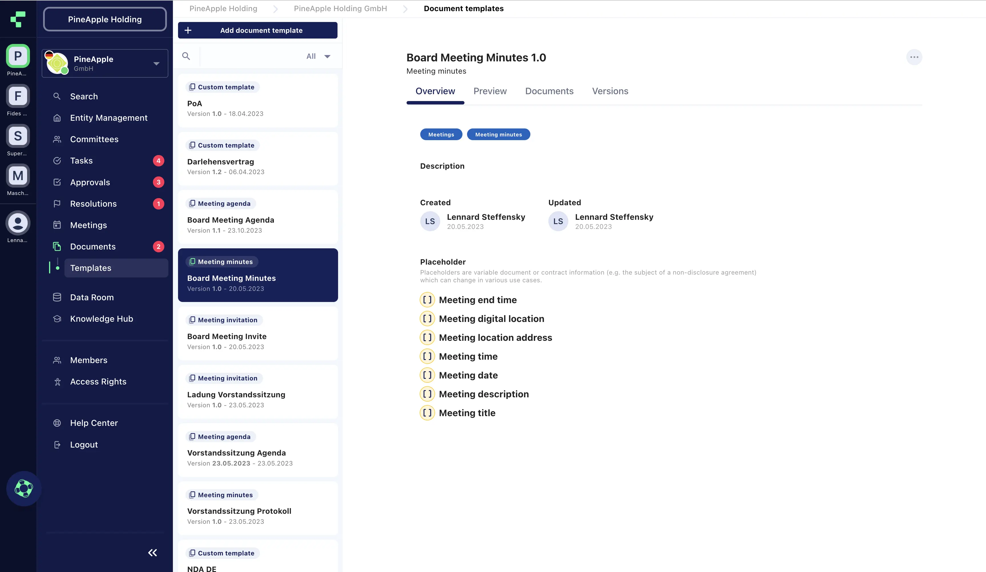 Have your templates ready to use at any time. Include smart placeholders for documents that are needed regularly. Our customers use this feature for various types of documents: from meeting agendas and minutes, to PoAs, Intercompany Agreements, to general documents like NDAs.